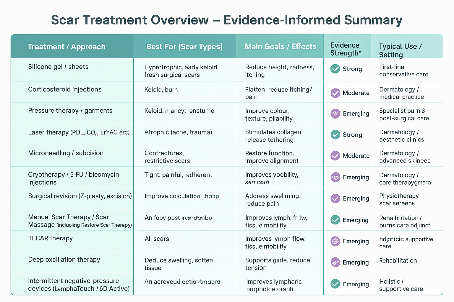 Strong evidence supports silicone gels, steroid injections, and some laser treatments, while newer methods like manual therapy, TECAR, or deep oscillation are evidence-informed — promising but still being studied.