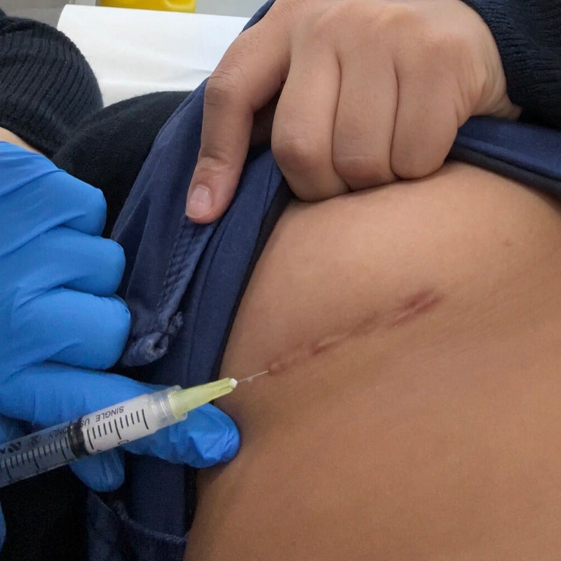 A medication (usually triamcinolone) is injected directly into the scar to reduce inflammation, redness, and thickness.