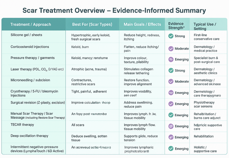 Strong evidence supports silicone, steroid injections, and several laser and microneedling protocols. Manual scar therapy, TECAR, deep oscillation, negative pressure, and kinesiotaping are evidence-informed adjuncts: they show promising clinical outcomes for pain, oedema, and mobility, but large, high-quality trials are still needed to confirm long-term remodeling effects.